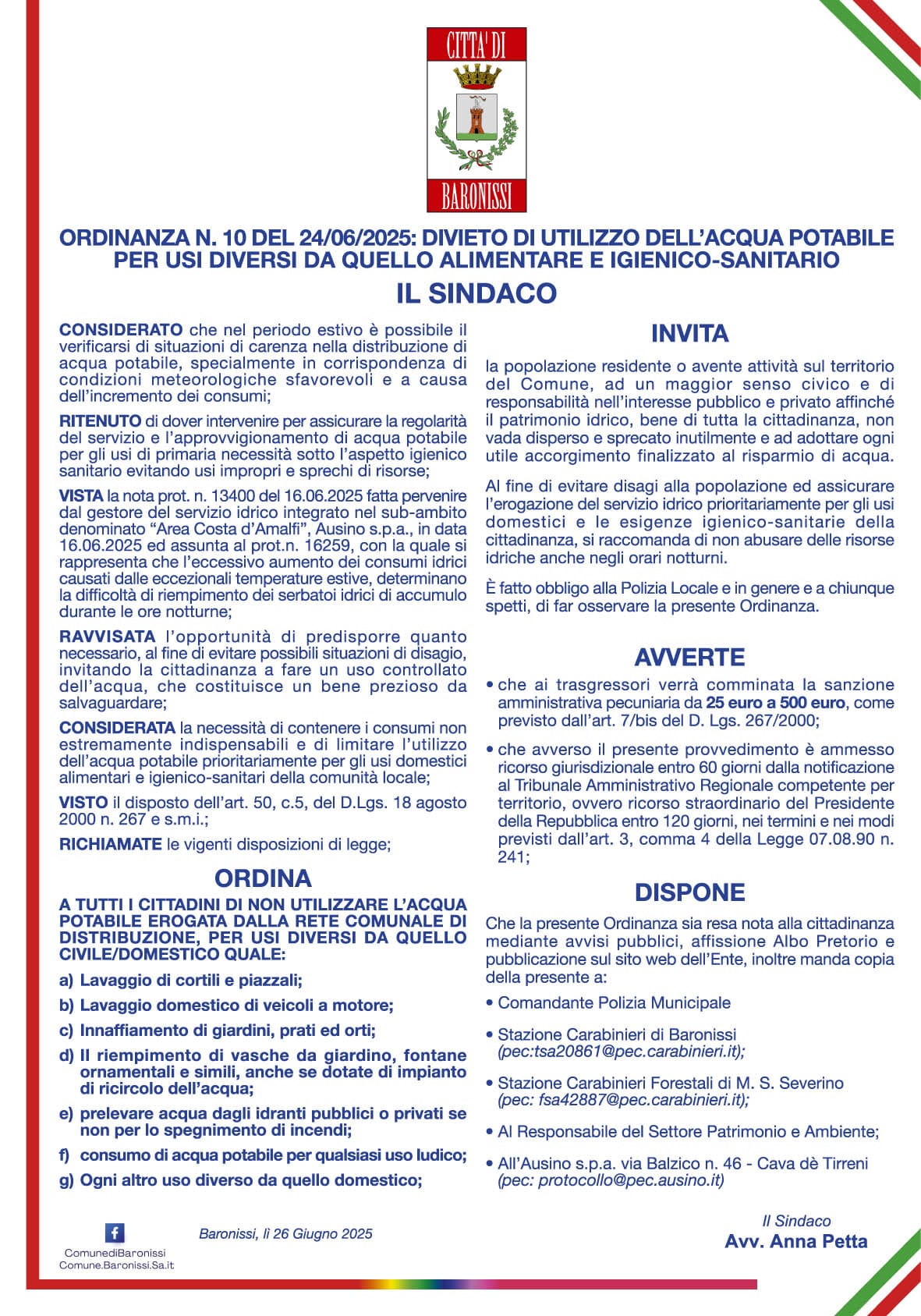 Ordinanza prevede di non utilizzare l'acqua potabile erogata dalla rete comunale di distribuzione per usi diversi da quello civile/domestico.